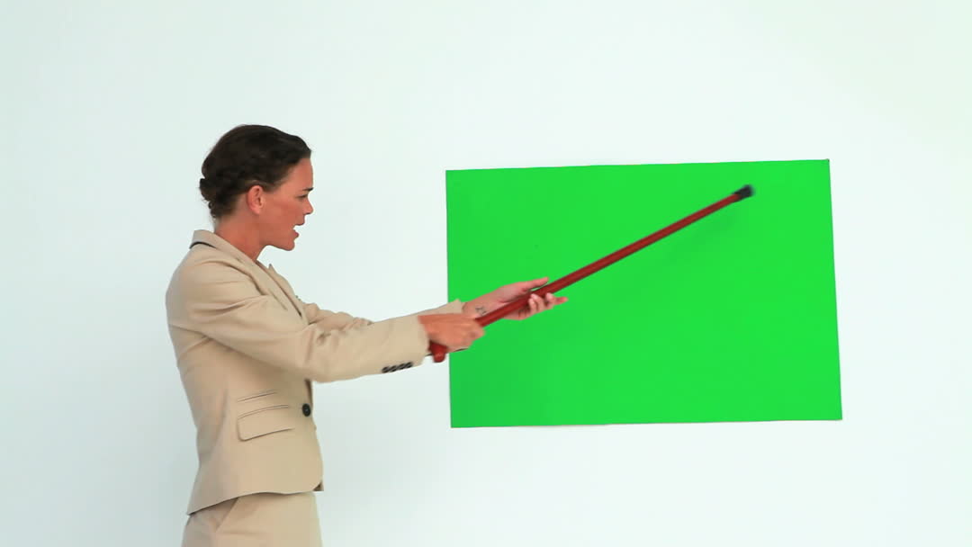 A businesswoman in a beige suit using a pointer to indicate details on a green screen backdrop. This can be utilized to represent corporate training, presentations, teaching scenarios, or business-related communications. As a metaphor for instruction and leadership, it could also serve for educational material or marketing in business settings.