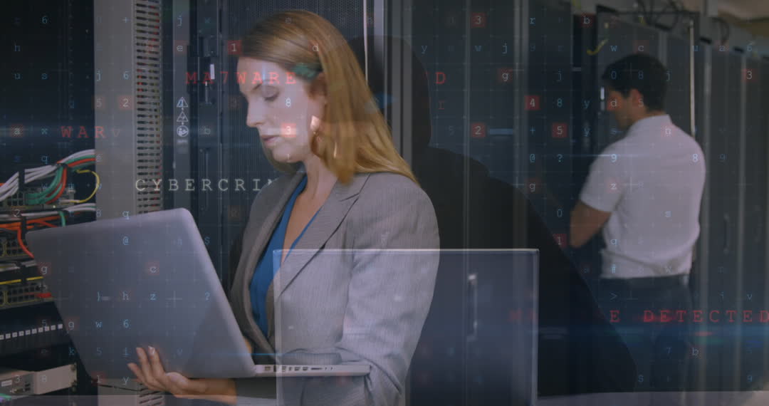 Businesswoman using laptop in server room, with overlaid text and numbers related to cybersecurity data. Ideal for illustrating concepts of digital security, financial technology, data protection, and professional IT environments. Use in articles, presentations, or marketing materials focused on tech and cybersecurity industries.