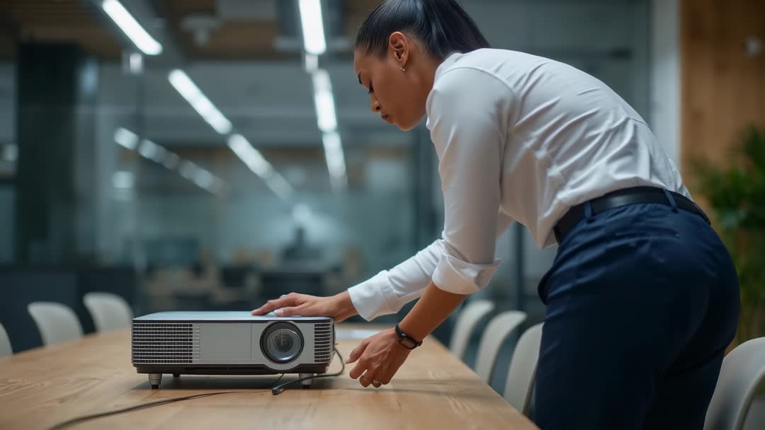 AI Generated Image. Showing businesswoman adjusting projector and tidying cable on long conference table in modern office. Camera focusing on side profile and hands while background keeping soft bokeh of empty chairs, glass walls, and linear ceiling lights. Footage working well for corporate presentation intros, AV setup tutorials, internal training, office workflow stories, and marketing campaigns. Providing clean negative space on left for overlay text, logo placement, or lower third graphics. Suitable for website hero banners, social media clips, e-learning modules, product demo videos, and corporate communications. Advising slow push-in or slight pan to emphasize attention to detail and to allow room for voiceover or background music.