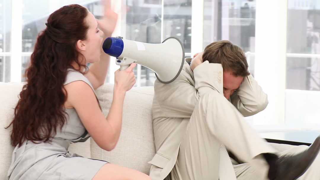 Female executive expresses frustration using a megaphone, while a male colleague covers his ears defensively. The scene conveys tension and lack of effective communication within an office environment. Suitable for illustrating office conflict, communication problems, or advocacy against workplace stress.