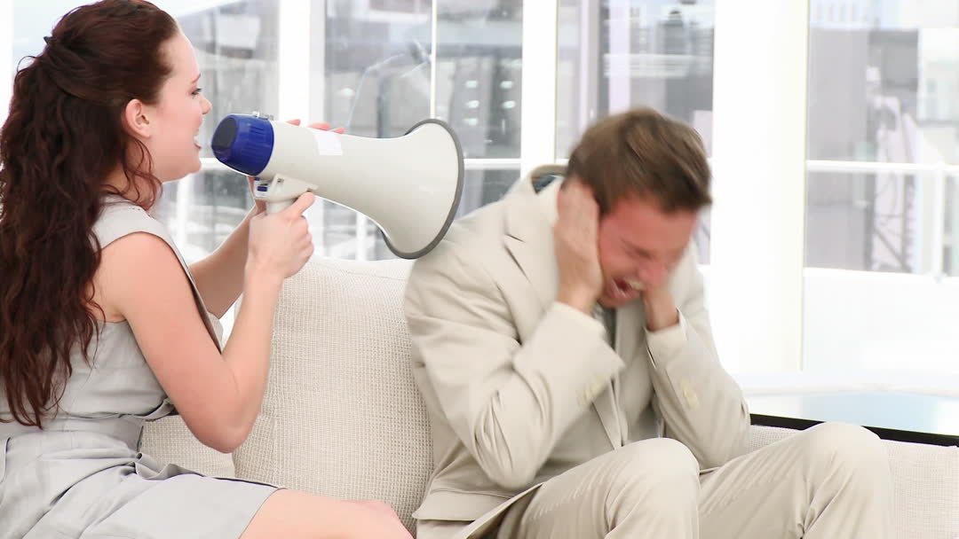 A businesswoman seen shouting through a megaphone at a male colleague who is covering his ears. This scene portrays elements of conflict and poor communication in a professional setting. Ideal for illustrating concepts related to office conflicts, workplace noise issues, or aggressive communication styles.