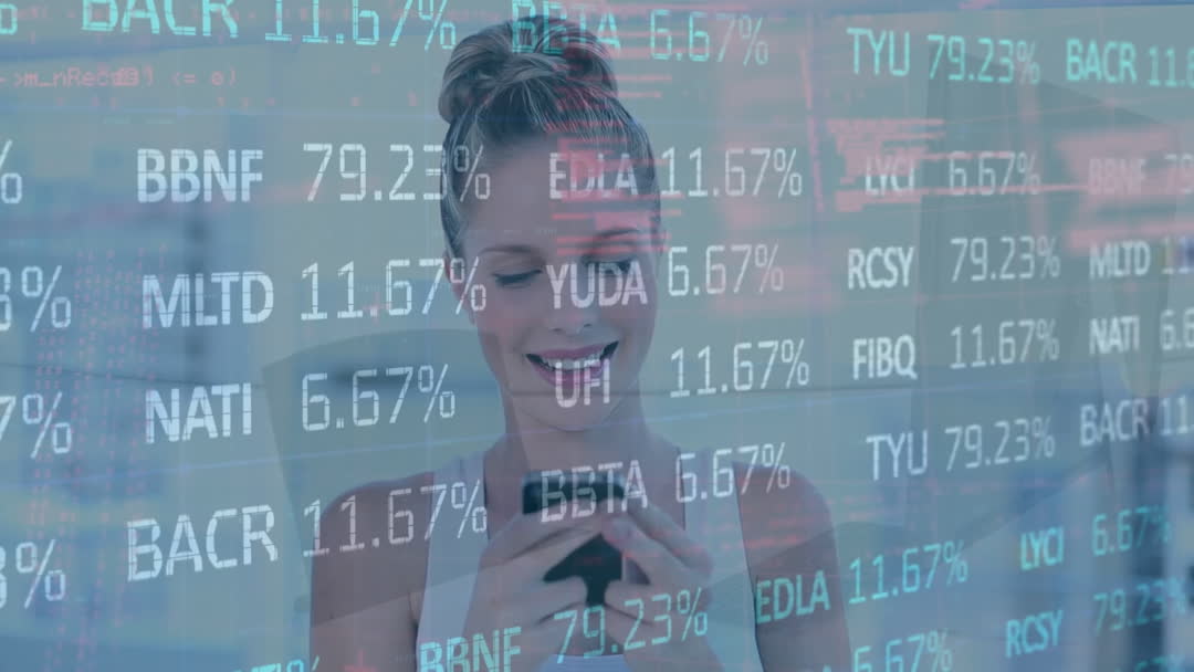 A businesswoman smiling as she engages with her smartphone, overlaid by digital stock market data in a futuristic setting. Ideal for depicting themes related to modern fintech, investment strategies, global finances, technology-driven business solutions, and digital communication advancements. Perfect for illustrative use in financial services marketing, tech company promotions, or investment consultation advertisements.