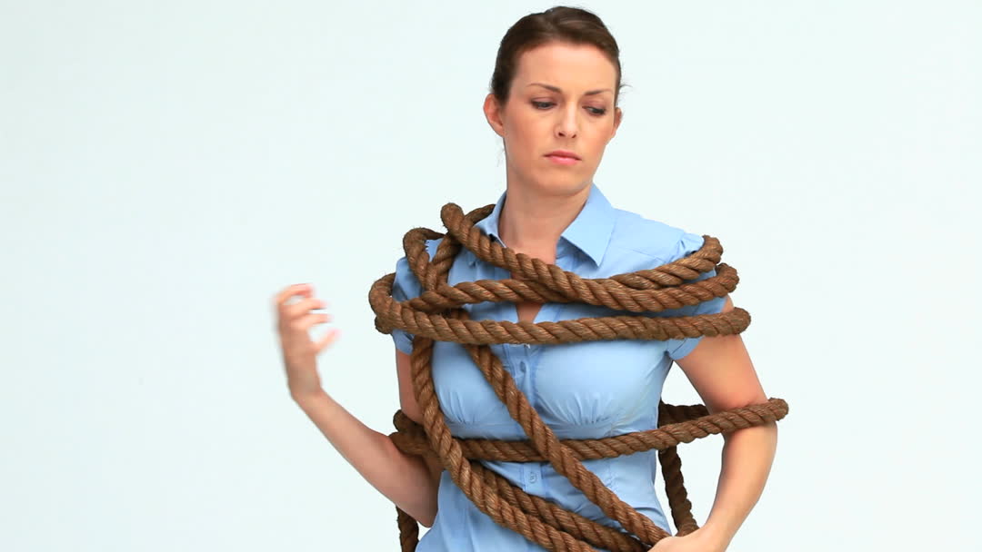 A professional woman, wearing a blue blouse, appears entangled in a rust-colored rope against a plain white background, symbolizing concepts like modern business challenges, professional constraints, or self-limitation. Useful in contexts exploring corporate dynamics, psychological struggles, and motivational materials.
