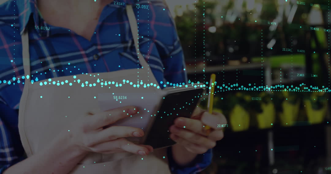 Concept combining technology and finance depicts an entrepreneur or shop owner using a digital payment terminal, symbolizing digital transactions and financial data. Great for illustrating modern commerce, financial analysis, and technological advancements in retail industry.