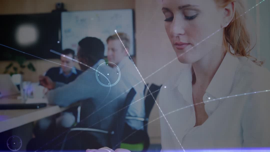 - Businesswoman Using Digital Tablet with HUD Interface in Meeting