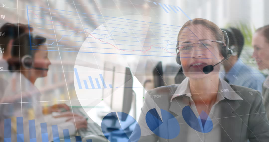 Businesswoman Using Headset with Data Analytics Overlay Video