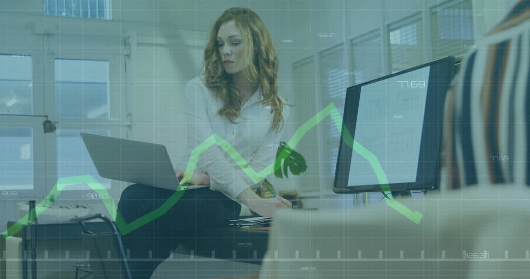 Businesswoman in modern office using laptop, focusing on fluctuating data represented by animated graph overlay. Suggests themes of technology-driven work, data analysis, and professional productivity. Useful for illustrating business analytics, remote work, and modern business environments.