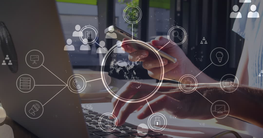 This video depicts a businesswoman using a laptop and smartphone with overlay graphics of interconnected icons symbolizing global connectivity and digital networking. It illustrates themes surrounding modern business technology, internet security, data sharing, and innovative communication methods. Useful for illustrating digital transformation, security strategies, and global business operations in corporate and tech industry materials.