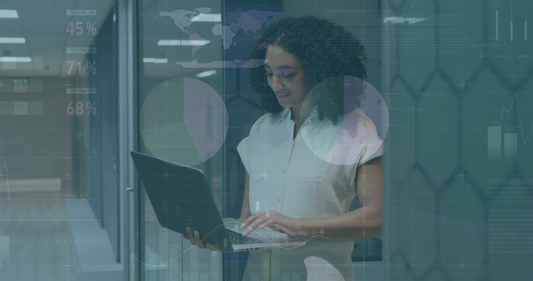 Businesswoman working on a laptop with digital data analysis graphics superimposed conveys a high-tech, dynamic work environment. Ideal for illustrating content on data-driven decision making, technology in business, or articles about modern corporate trends.