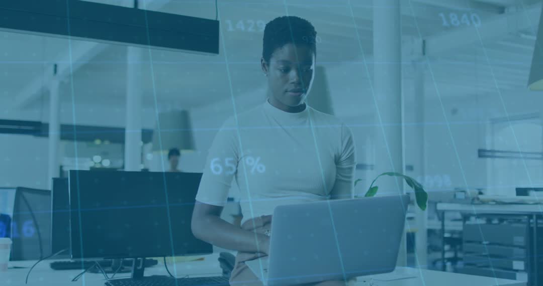 A businesswoman works on her laptop in a modern office, with animated data processing graphics superimposed over the scene, highlighting the influence of digital technology in her work. This visual is great for illustrating themes of digitalization in business, tech companies, IT team activities, modern office environments, and corporate analytics solutions.