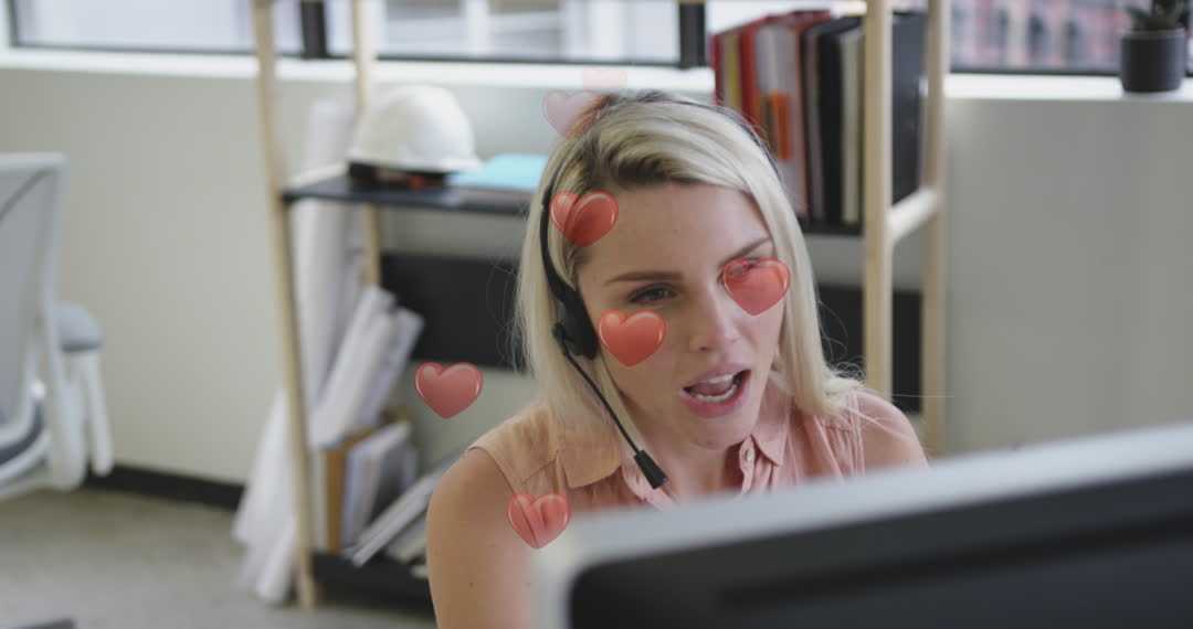 Businesswoman working on laptop, blending professional demeanor with playful digital heart icons animation. Ideal for illustrating modern work environments, the fusion of business with digital technology, or concepts related to online meetings and remote communication.