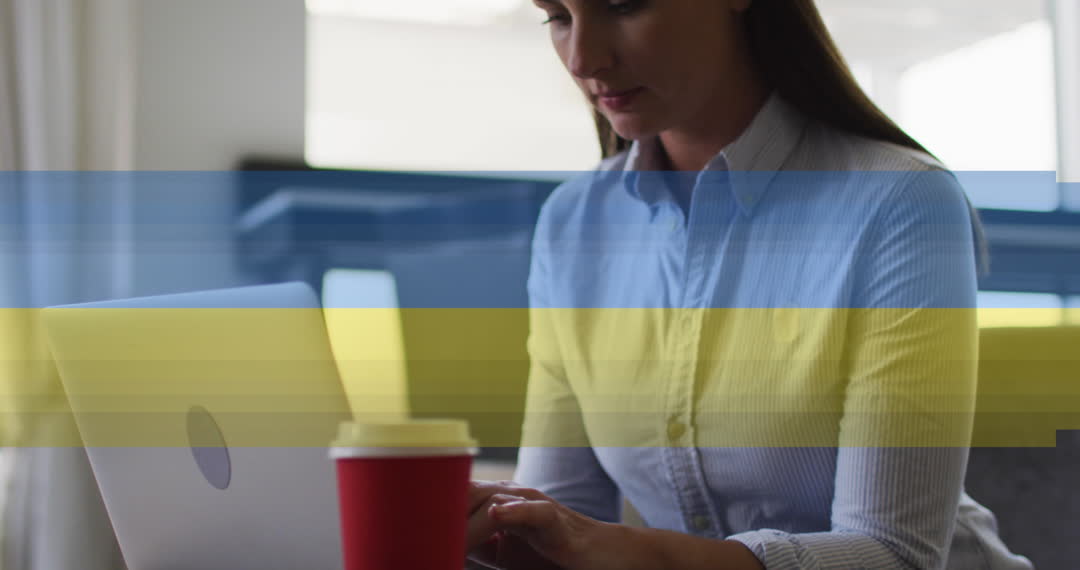 Businesswoman is using a laptop in a contemporary office with a digital overlay of striped themes and colors. Could be ideal for presentations on modern technology in business environments, articles related to easy integration of digital tools in workplaces, or advertising sets focusing on coworking spaces.
