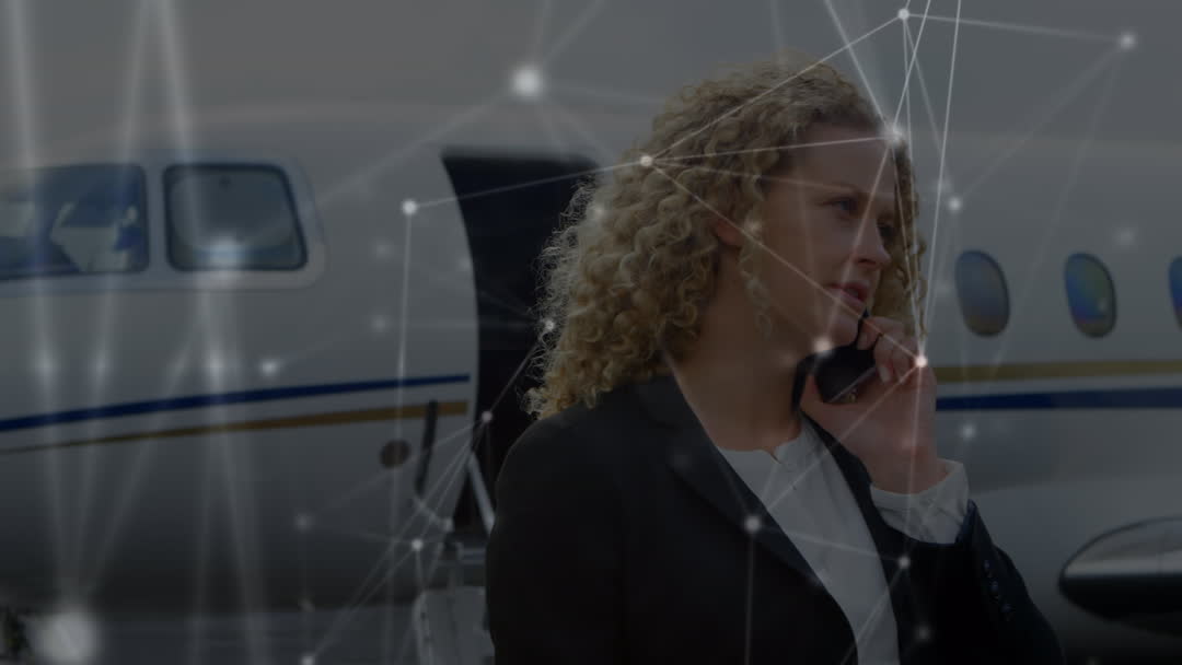 Businesswoman with curly hair stands near a private jet, speaking on her smartphone with digital network graphics overlayed. Ideal for illustrating the blend of modern technology, connectivity, and high-profile business travel. Suitable for content about global business communication, the tech-savvy corporate world, and luxury travel industry insights.