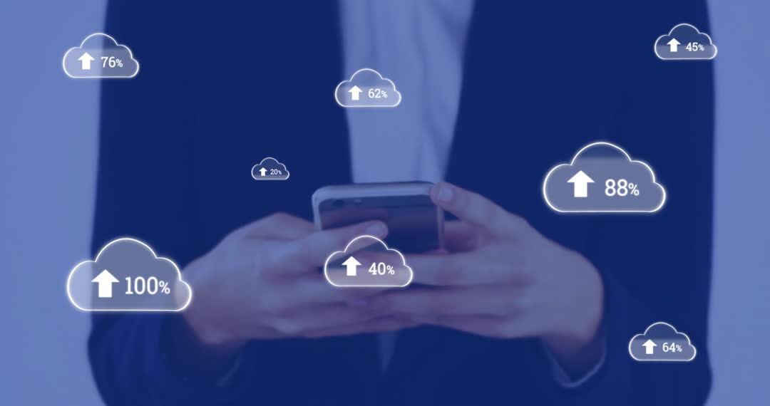 Animation shows businesswoman using smartphone while cloud computing icons display uploading data percentages. Visual symbolizes digital connectivity, modern technology trends, and futuristic innovation. Ideal for marketing materials or articles about digital transformation, data management, and technological advancements.