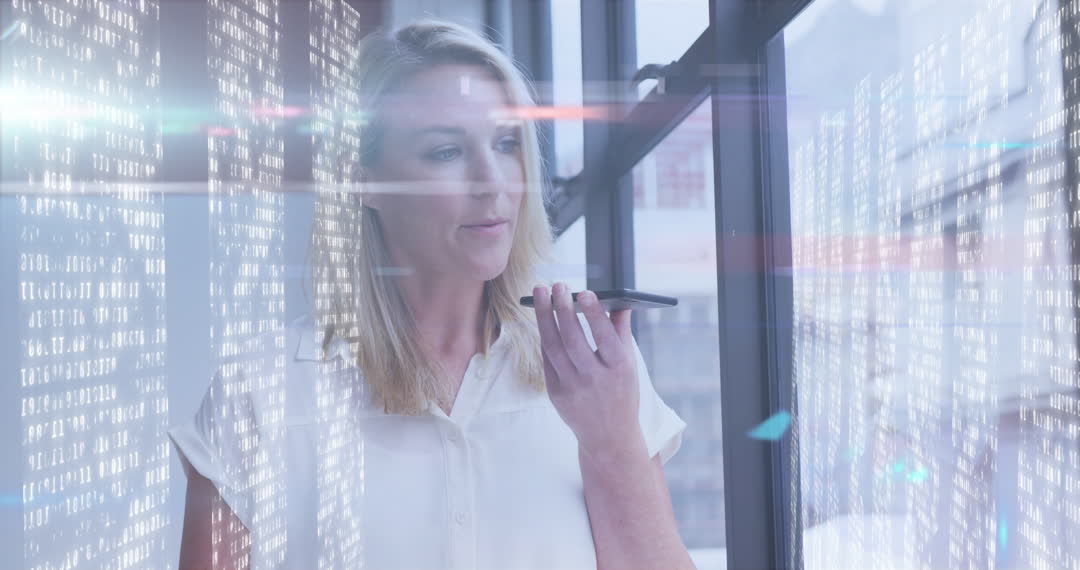 - Businesswoman Using Smartphone with Data Overlay in Office