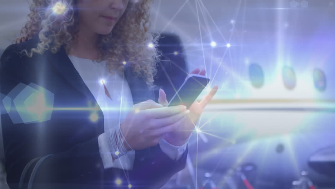 - Businesswoman Using Smartphone with Digital Network Overlay at Airport