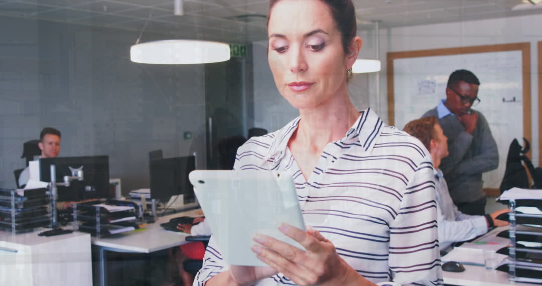 - Businesswoman Using Tablet in Modern Office with Financial Data Overlay