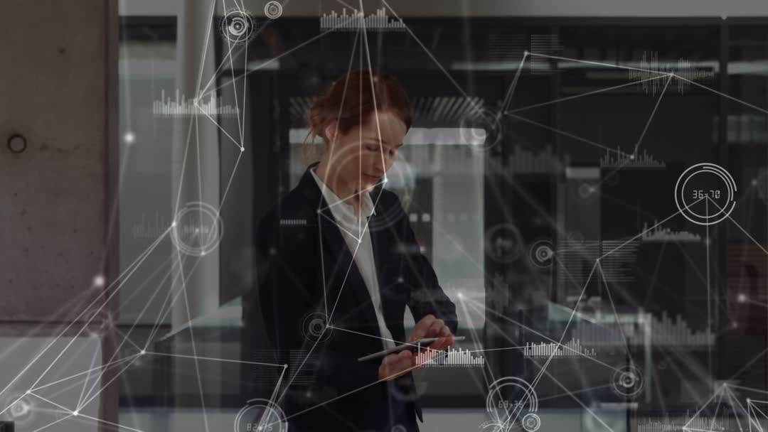 - Businesswoman Using Tablet with Conceptual Network Overlay