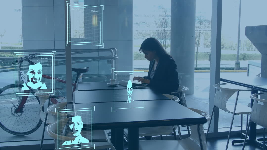 A businesswoman is using a tablet with digital interface elements like icons and portraits projected outwards, overlooking a modern office environment. This videory suggests connectivity, communication, and technological advancement in professional settings. It could be used to illustrate concepts of digital innovation, workplace technology, and cyber interfaces in media promotions or technology-focused content.