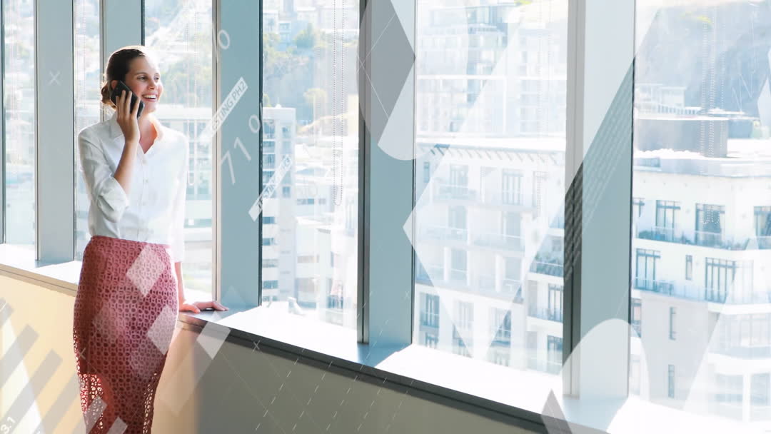 A professional woman is on her smartphone, emphasizing the use of mobile technology in modern business. The overlay of financial data symbols and a cityscape indicates a global financial perspective and business connectivity. Ideal for business and finance websites, digital communication themes, or presentations about global markets.