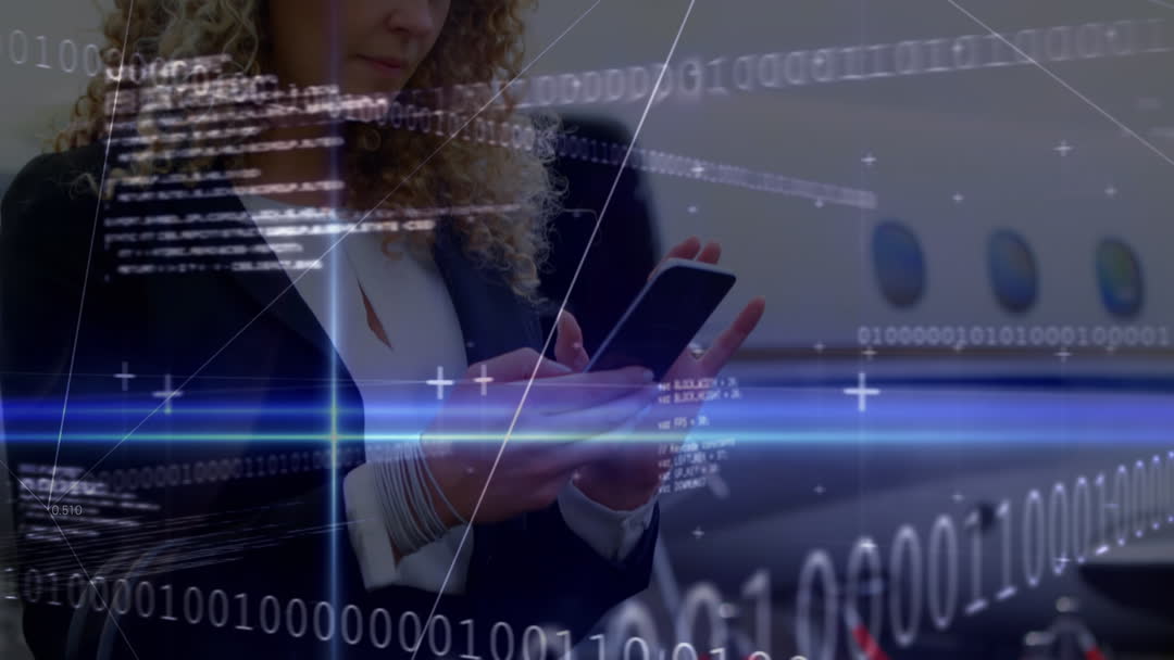 Businesswoman using a smartphone surrounded by digital network patterns and binary code at an airport. Ideal for depicting modern business travel, technology integration in business, or communications in a global economy.