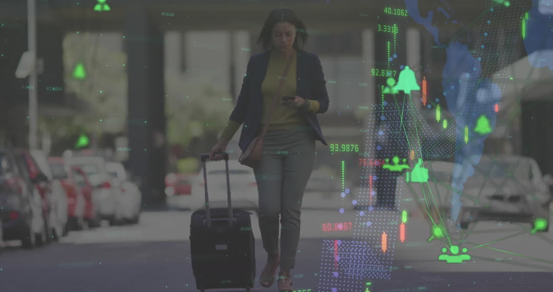 A professional woman walks on the street with a trolley bag, while digital finance graphics overlay the scene, indicating global networking and connection concepts. Ideal for illustrating themes in business travel, global finance trends, networking opportunities, economic data integration, and career growth in a tech-centered world.