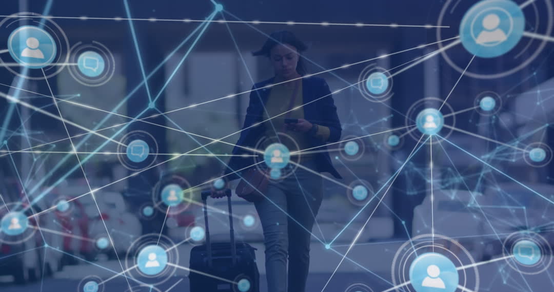A businesswoman is walking on a city street with a trolley bag, surrounded by overlays of digital network graphics. Ideal for illustrating global communication, travel through technology, the integration of digital networks in everyday business practices, and the connection of professionals worldwide.