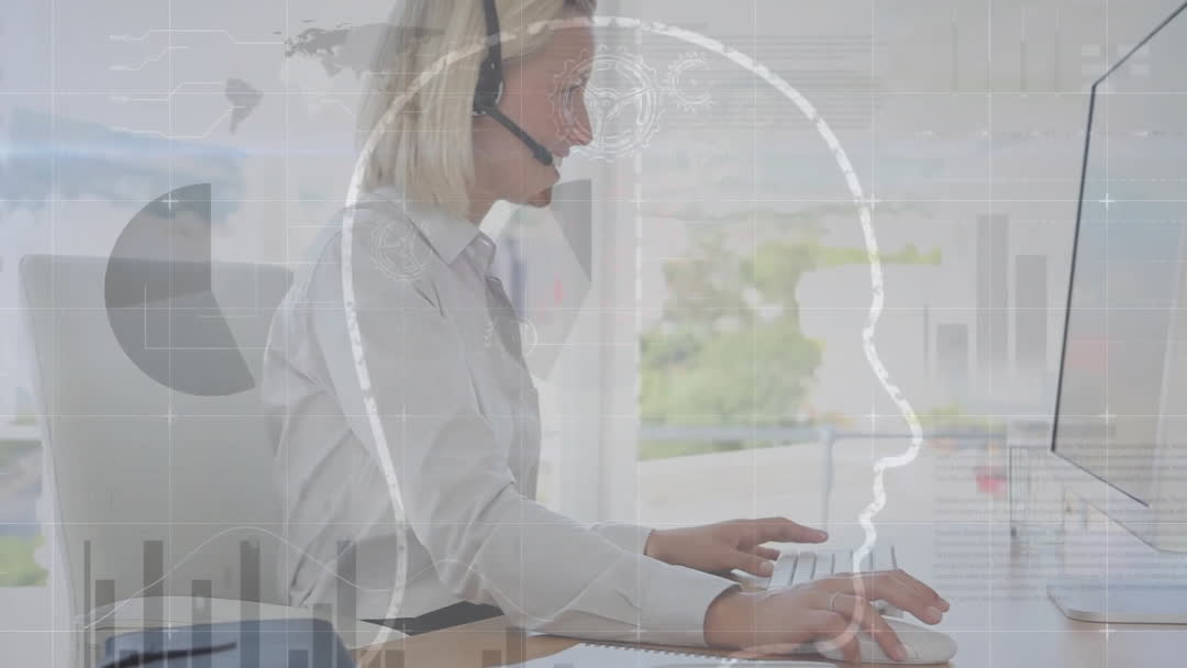 Businesswoman wearing headset using computer for analyzing complex financial data. Transparent graphics overlays with statistics symbolize technological innovations in data analysis and finance. This visually engaging concept is ideal for illustrating technology in the finance industry, virtual workspaces, customer service roles, and business analytics.