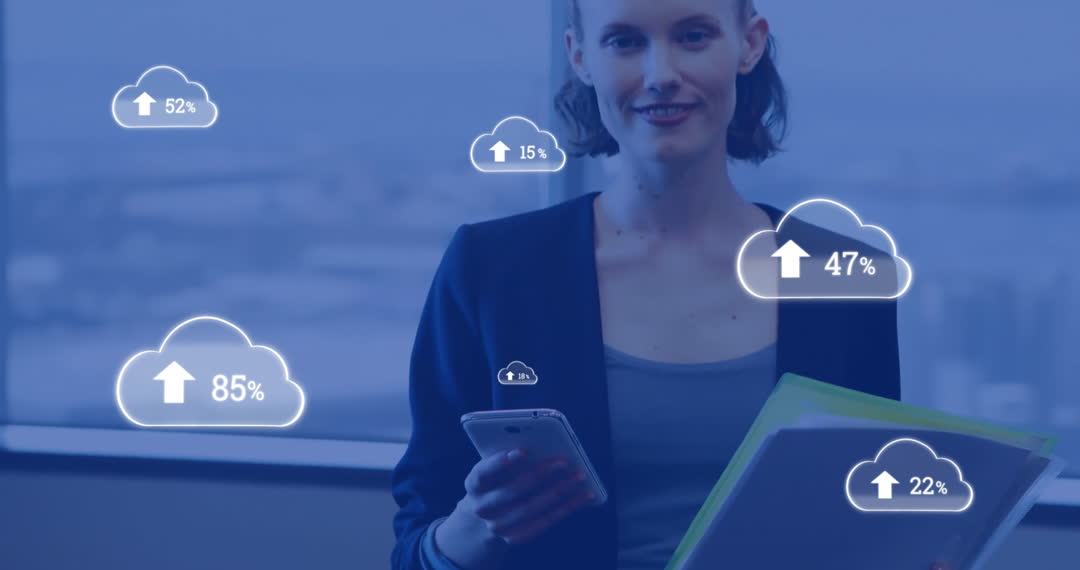 This video features a professional businesswoman holding a smartphone and documents, with graphic animations of cloud symbols indicating data uploads. It illustrates the concept of digital connectivity, data sharing, and communication in a modern business environment. Ideal for use in articles or presentations about cloud computing, network technology, or digital transformation in the workplace.