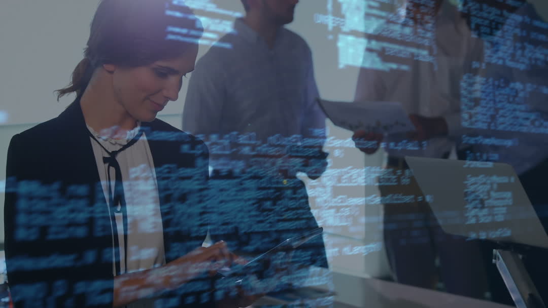 This scene showcases a confident businesswoman engaging with digital data on a device in a modern office. The overlay of dynamic codes and programming lines suggests active involvement in technology and innovation. Colleagues are blurred in the background, implying teamwork and collaboration in a professional setting. Ideal for depicting a tech-driven and collaborative working environment, suited for use in business, technology, and future-focused publications.