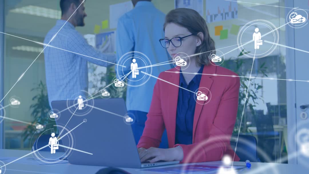 Businesswoman in an office working on a laptop with digital network connections overlay. The video illustrates concepts of modern communication, technology integration, and professional networking. Ideal for use in tech articles, business presentations, and corporate marketing materials to depict innovation and digital transformation in business environments.