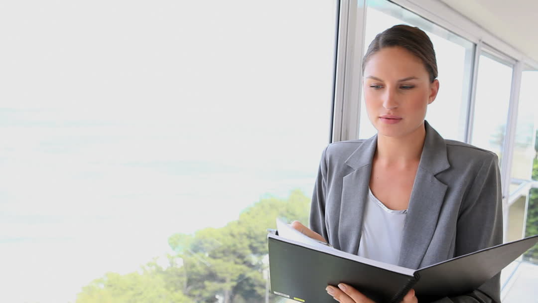 Businesswoman in a professional suit writing on a file near a large, bright window in an office. Ideal for concepts related to corporate work, business strategies, office environments, and professional conduct. Useful for promoting career services, office spaces, and business tools.