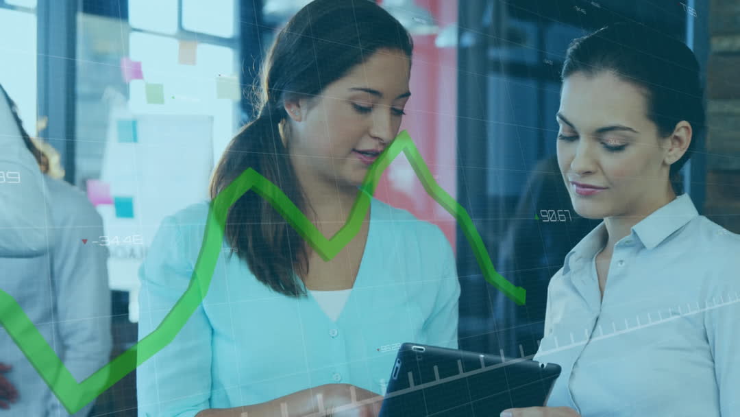 Two diverse businesswomen are collaborating in a modern office setting, examining data on a digital tablet. Green data charts overlay highlight analysis and decision-making. This video is ideal for marketing materials related to corporate teamwork, modern business strategy, technological integration in workplace, or diversity in professional environments.