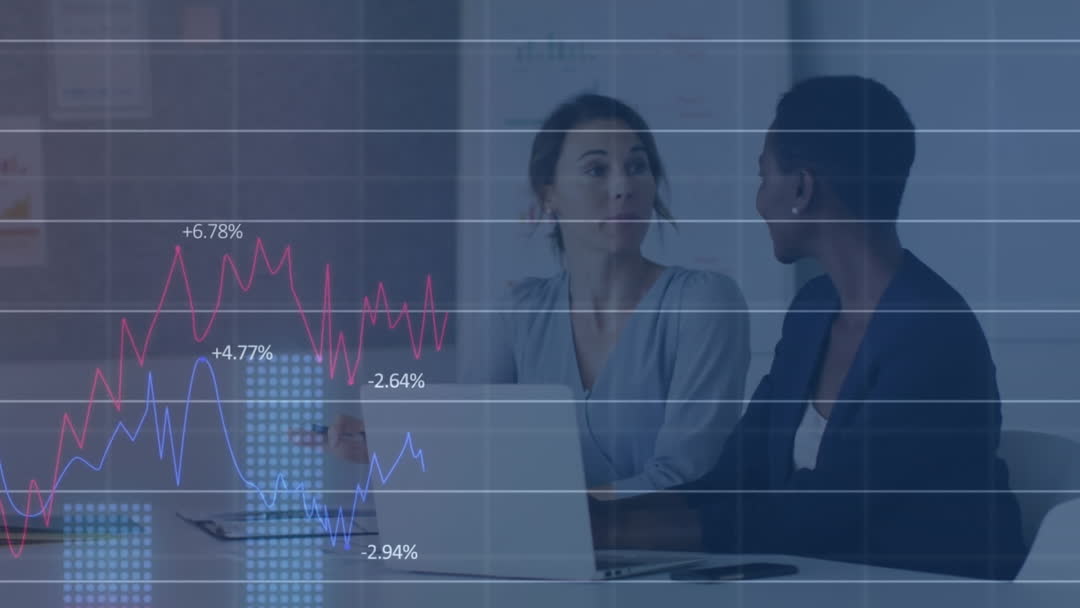 Two diverse businesswomen engage in a discussion while interpreting data overlaid with statistical graphs. Ideal for illustrating themes of teamwork, professional collaboration, and business data analysis. Useful for articles, presentations, or educational materials focusing on business strategy, financial analysis, or corporate environments.