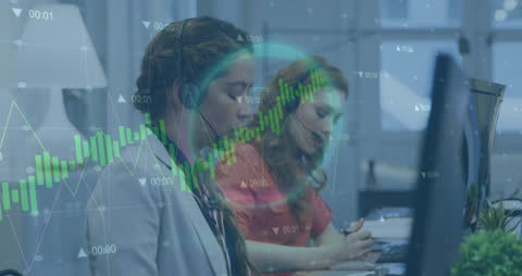 Businesswomen focus on analyzing financial data in an office setting, with data metrics and digital graphs overlay implying data processing and digital finance services. Useful for illustrating modern office environments, business analytics services, and technology in finance.