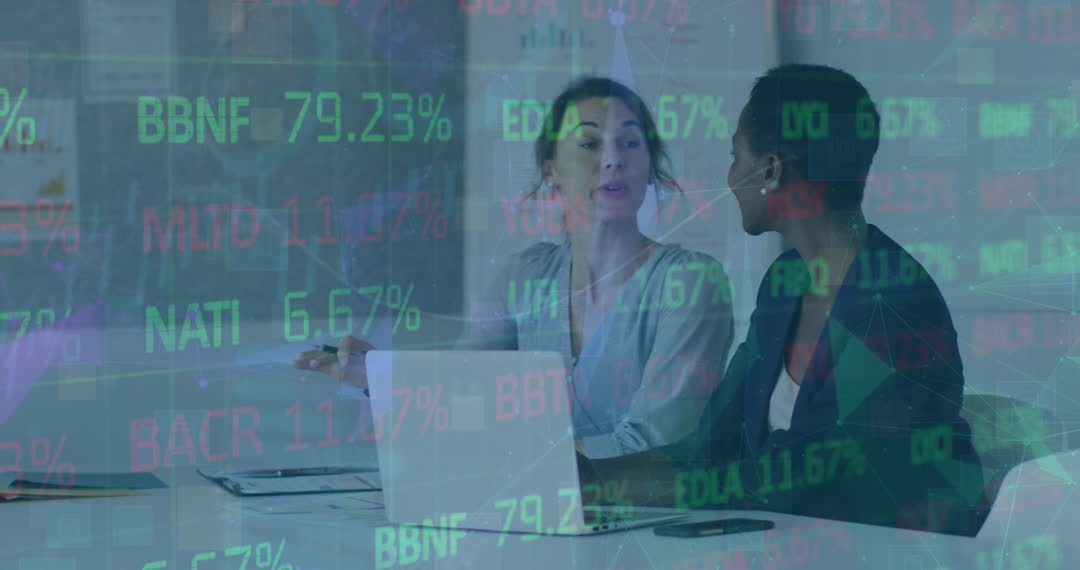The video shows two businesswomen engaging in a discussion at an office table while financial data is overlaid digitally. Use this for content related to finance, teamwork, diversity in business environments, or modern work dynamics facilitated by technology.