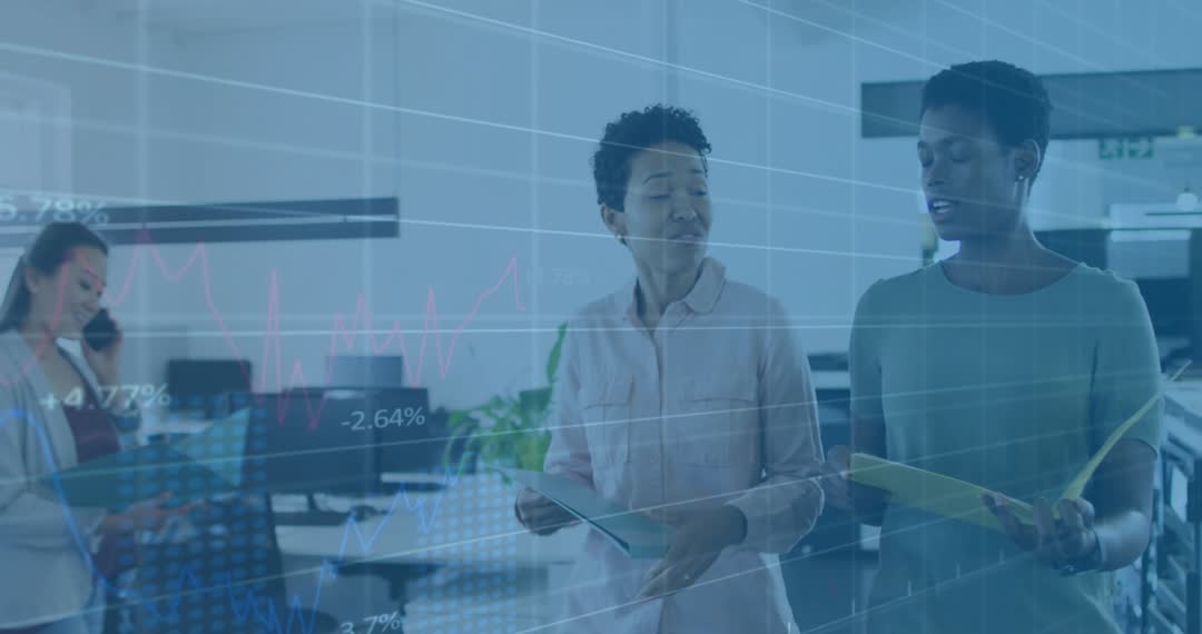 Women engaging in a discussion about financial data in a professional office with digital chart overlay. Ideal for illustrating articles or marketing materials related to business analytics, financial reporting, or corporate strategy. Highlights interaction and teamwork in a modern workplace setting.
