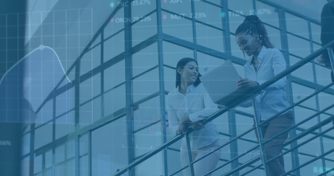 - Businesswomen Discussing on Stairs with Financial Stock Data Overlay