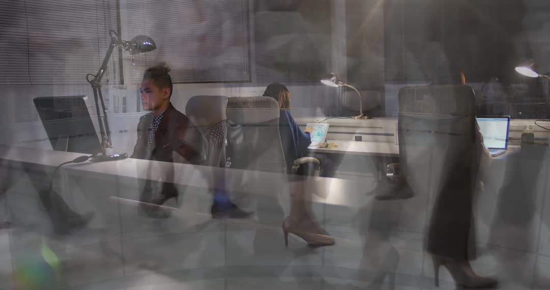 A dynamic scene showing business professionals in an office setting with an overlay of people walking. This innovative blend highlights the busy and interconnected nature of modern workplaces. Perfect for illustrating themes of teamwork, multitasking, global business connections, and the impact of technology on work environments. Useful for corporate websites, business presentations, and articles on modern work culture challenges.