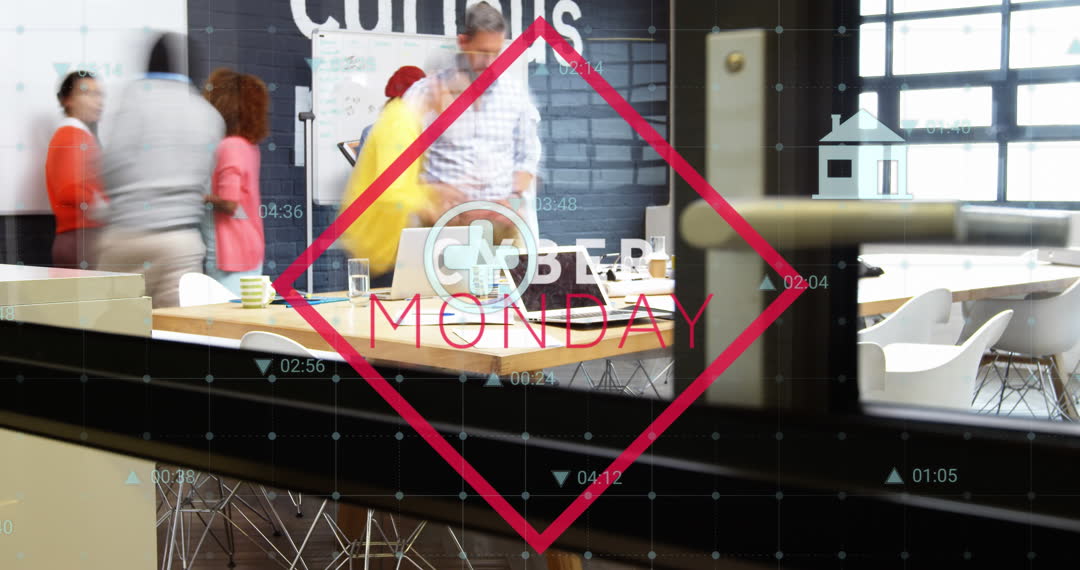 Busy Office Scene with Cyber Monday Data Overlay Video