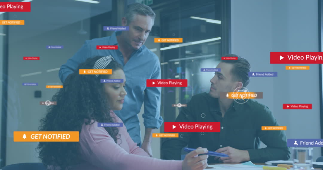 Scene depicts business professionals in a modern office environment, engaging with technology. Various social media icons such as 'Get Notified' and 'Video Playing' are digitally overlaid, symbolizing connectivity and data-driven interactions. Useful for illustrating themes of collaboration and digital communication in contemporary corporate settings.