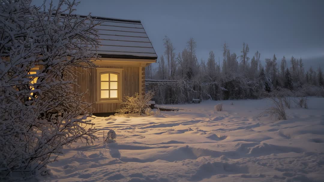 AI Generated Video. Frame showing small wooden cabin at edge of frosted forest, warm amber light glowing through window and casting soft pool of light onto snow-covered field under deep blue twilight. Scene evoking cozy solitude and winter calm, creating strong contrast between warm interior tones and cool outdoor blues. Snow texture and long shadow patterns providing cinematic foreground with empty negative space on right for headlines or logos. Working well for cinematic backgrounds, seasonal marketing, holiday greeting animations, website hero banners, travel and tourism promos, real estate winter listings, social media reels, or mood-setting broadcast graphics. Clip providing loopable ambient footage for intros, overlays, or ambient video walls. Postproduction suggestions: gentle color grade boosting amber highlights, adding subtle film grain, slow pan or gentle push-in to increase intimacy, and soft vignette to focus attention on window glow. Ideal for conveying warmth amid cold, promoting winter escapes, holiday offers, cozy lifestyle campaigns, or background for text and logo overlays.