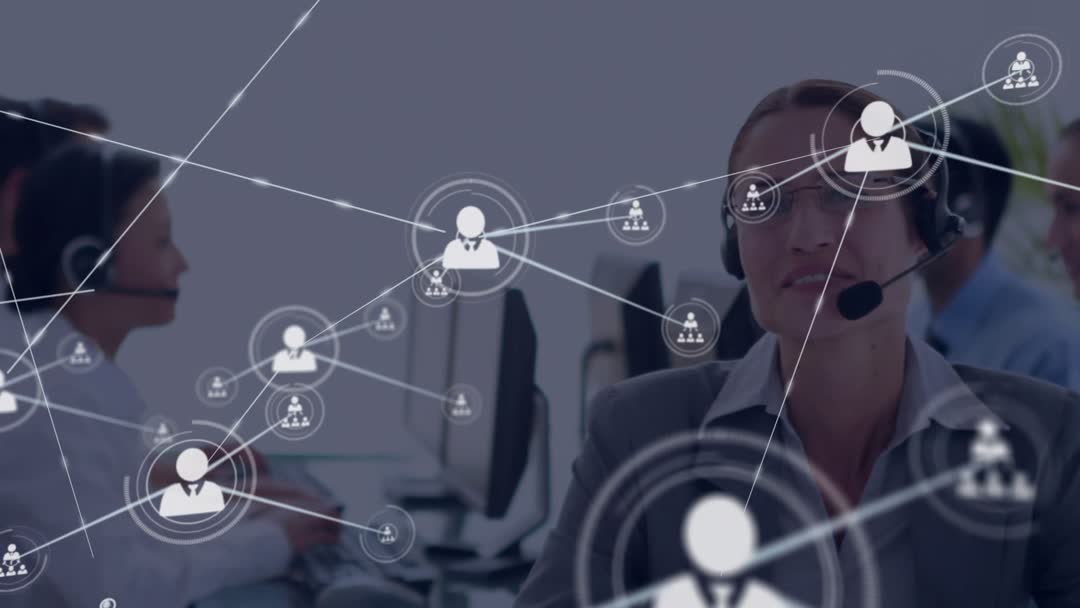 Footage showcases call center agents with headsets in a busy work environment featuring a digital network interface overlay. Use in presentations on customer service efficiency, telecommunications advancements, and corporate connectivity solutions, highlighting teamwork and technological integration in business operations.