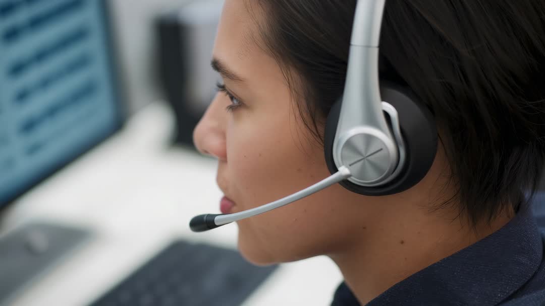 AI Generated Image. Video clip showing call center agent taking incoming call, wearing over-ear headset with boom microphone, speaking calmly while viewing customer information on monitor. Profile close-up with shallow depth of field, background monitor and keyboard softly blurred, dark collared shirt conveying professional tone. Footage suiting customer service training modules, recruitment ads, website hero sections, social media campaigns, corporate presentations, and e-learning tutorials. Providing left-side negative space for text overlay, lower-third graphics, or logo placement. Working well for telecommunications and SaaS support pages, help desk guides, internal communications, and promotional materials requiring authentic on-the-phone interaction visuals. Color palette neutral with soft office lighting, crop compatible with widescreen video and mobile formats.