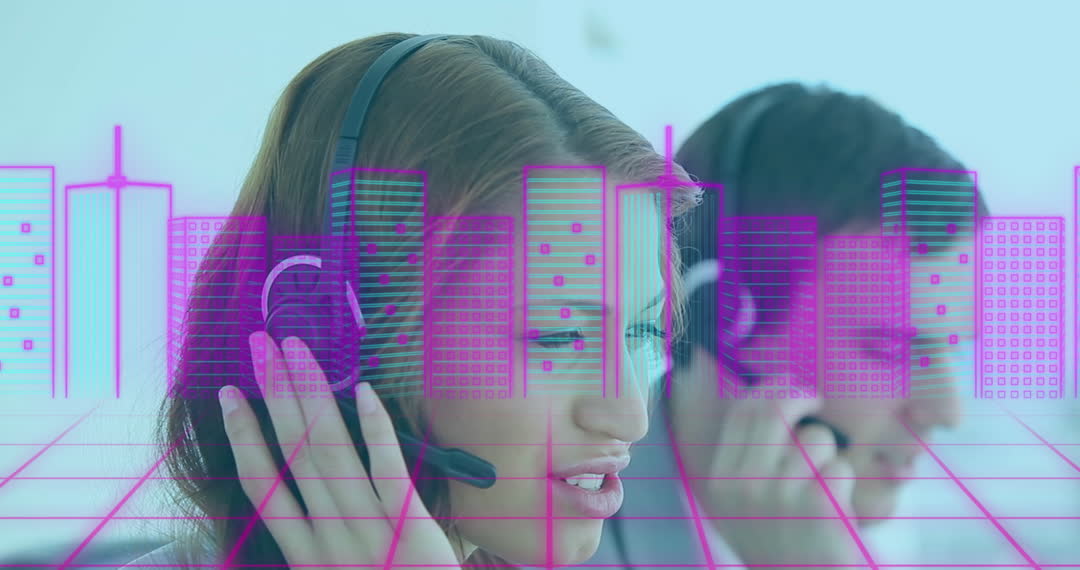 This video captures two call center agents conversing over headsets in a bright, dynamic office environment. One agent is smiling and engaged, suggesting a positive interaction, while the other appears frustrated, highlighting the various challenges in customer service. The stylized digital effects convey a high-tech atmosphere, making this visual ideal for illustrating customer service roles, technological advancements, or promotional materials for communication training solutions.