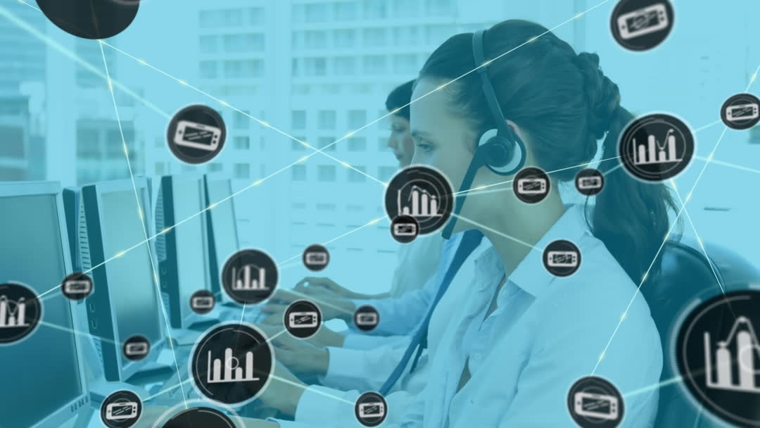 This video shows professional call center operators wearing headsets and actively engaging on computers. Overlaid digital icons depicting network charts and technologies suggest a sophisticated tech environment, symbolizing global communication and business networking. Perfect for illustrating concepts related to modern workplaces, digital tools, teamwork, customer service, and efficient business operations. Useful for articles or marketing material on tech-driven customer service.