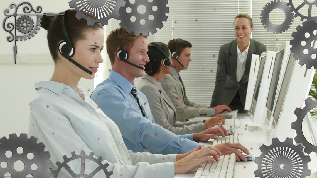 - Call Center Team Engaged in Customer Support with Gears Overlay