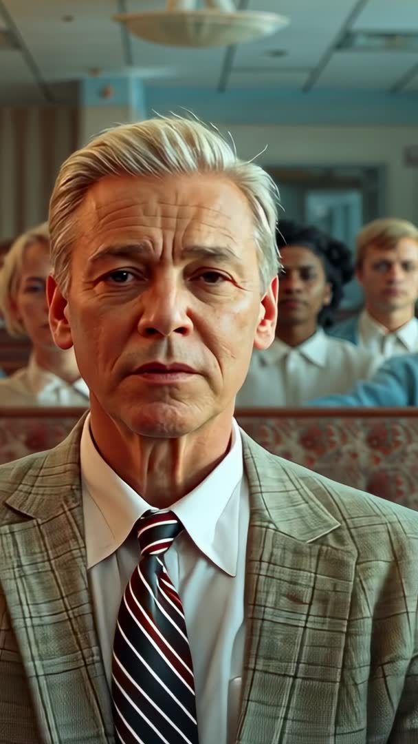 AI Generated Image. Showing close-up vertical footage of senior man in plaid suit sitting in diner booth, camera closing in and revealing jaw tightening. Featuring striped tie, lined face, serious expression, and subtle background of other diners for contextual depth. Conveying interpersonal tension, quiet determination, or moment of realization. Useful for dramatic film scenes, TV promos, legal or medical storytelling, commercials about aging or insurance, and emotional social campaigns. Suitable for B-roll, title sequences, character intros, and mood-evoking montages. Recommend pairing with minimal slow-tempo music and tight color grade to enhance cinematic tension.