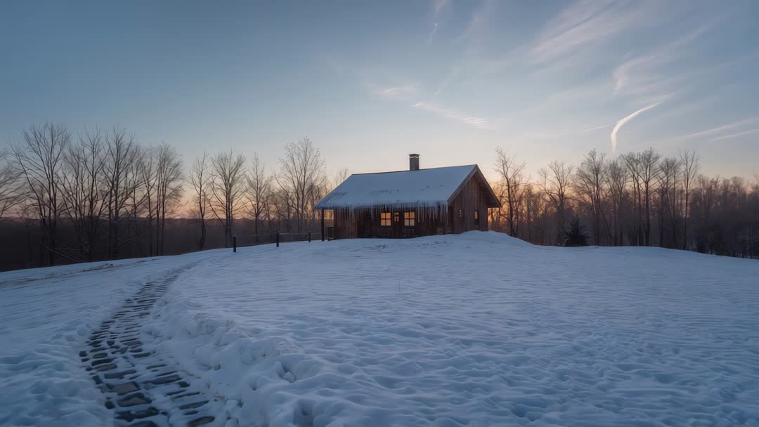AI Generated Video. Video clip showing camera dolly approaching rustic wooden cabin perched on snow-covered hill at dusk, windows glowing with warm amber light. Foreground featuring curved stone path with footprints leading toward cabin, creating sense of journey and human presence. Background featuring bare deciduous trees silhouetted against pastel sunset sky. Cinematic mood combining cool blue snow tones with warm interior glow, ideal for conveying cozy retreat, solitude, or winter escape. Use for travel and tourism promos, lodge and vacation rental marketing, winter holiday campaigns, wellness and retreat videos, film establishing shots, social media teasers, website hero backgrounds, and documentary B-roll about rural life. Design tip: place title or lower-third text in sky area for clean composition; try slow push-in or crossfade transitions to emphasize atmosphere. Clip works well in HD and 4K projects, seasonal ads, blog headers, and atmospheric scenes for film and TV.