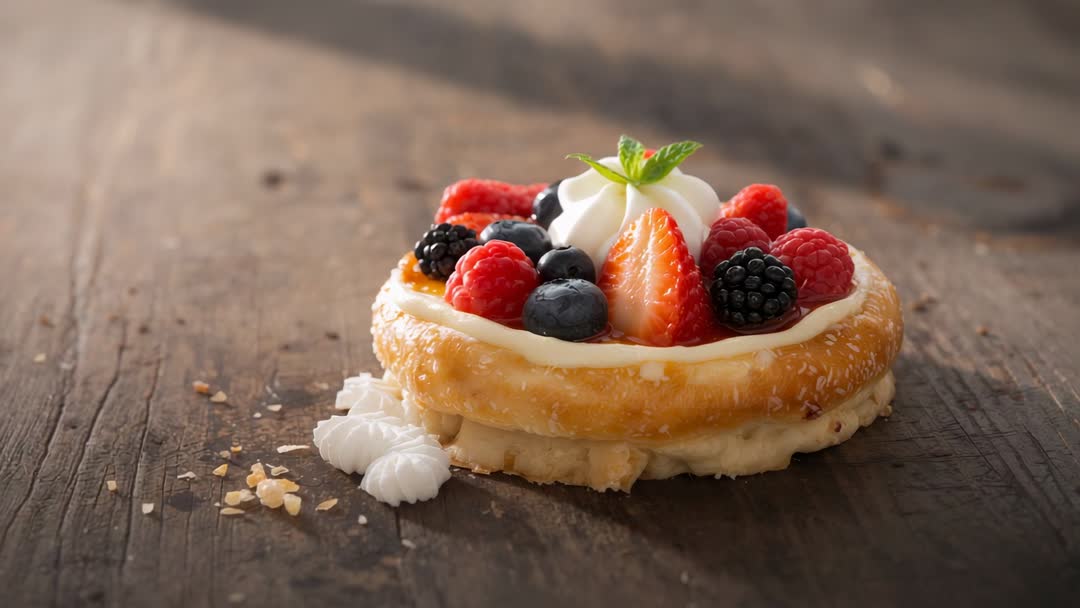 AI Generated Image. Short cinematic food video clip showing camera dollying over rustic wooden table while focusing on glazed berry tart topped with cream, fresh strawberries, blueberries, raspberries and blackberries, finished with mint leaf and small meringue crumbs. Shallow depth of field and warm studio lighting producing glossy highlights on glaze and rich texture in pastry crust. Composition leaving negative space for text or lower third overlays, making clip ideal for recipe intros, cafe menu backgrounds, social media reels, bakery promos, cooking tutorials, pastry commercials and food blog headers. Clip running well as 6–12 second hero shot or loopable cutaway, and working smoothly for color grading, slow motion beauty shots, and product showcase sequences.